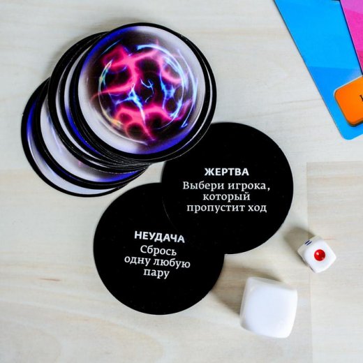 Жетоны бывают 3 видов: бонусы, подлянки и общие события. Используя их, вы сделаете игру увлекательней и быстрее придете к цели. А победителем станет тот, кто наберёт три пары ингредиентов для зелья. Он объявляется самым могущественным волшебником!