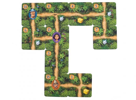 • Если на пути между искателем сокровищ и его храмом находится карта с другим искателем, то он преграждает путь первому искателю. В этом случае искатель не может пройти к храму и не приносит игроку победных очков.