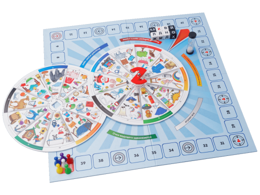 Вы ставите барабан на середину игрового поля, готовите часы и кубики. Потом раскручиваете стрелку - она попадает на какой-то сектор с разными картинками. Одновременно с этим вы бросаете кубики: на них выпадают буквы и цифры.