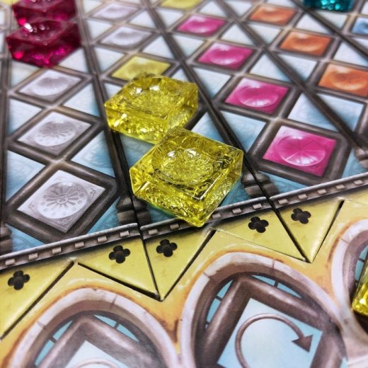 •Если у вас нет свободных клеток, совпадающих по цвету со взятыми фишками стекол, то все такие фишки считаются "разбитыми". Но если у вас есть хотя бы одна свободная клетка на одной из полосок витража, до которой ваш стекольщик может добраться, вы должны поместить фишки на свободные клетки соответствующего цвета на этой полоске витража – даже если бы вы хотели сбросить все фишки в стеклянную башню.
