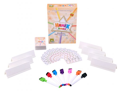 Оригинальность этой настольной игры заключается в том, что каждый из игроков придумывает свою подсказку для ведущего, записывает её, а затем из общего перечня созданных наводящих слов убираются одинаковые. Соответственно, чем неординарнее и изысканнее будут оставшиеся подсказки, тем больше шансов на то, что ведущий сможет сразу дать правильный ответ. В каждом розыгрыше используется 13 карточек со словами для угадывания, а побеждает тот, кто сможет набрать больше всех очков за счет своей сообразительности и догадливости. Намекайте оригинально и улавливайте суть намёков ваших друзей!