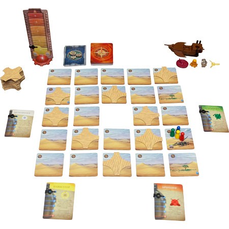 В дополнение к описанным выше действиям, находящиеся на одном жетоне игроки в любой момент игры могут передать друг другу Воду и карты Снаряжения, не тратя на это действия. Исследуя пустыню, вы можете переворачивать тайлы и обнаруживать под песчаными завалами остатки древнего города (именно здесь, судя по всему, и жили создатели пепелаца), каждая часть которых может обернуться удачной находкой, спасительной тенью (тот, кто не прячется от солнца, постепенно теряет запасы воды, а потом умирает – все строго) или даже колодцем с живительной влагой. Ну а для того, чтобы песок не казался вам сахаром, вам необходимо будет тянуть карты песчаных бурь (количество карт определяет специальная шкала, значение на которой будет только расти). Песчаная буря может передвинуть локации (вот для этого мы и оставляли свободное пространство в центре поля – тайлы будут перемещаться по принципу пятнашек, запутывая и без того замученных исследователей), нанести кучи песка (вам придется тратить действия на то, чтобы к середине игры не оказаться занесенным в центре огромной песочницы и разгребать завалы) и знатно вмешаться в планы по спасению ваших обгоревших частей тела. Раздобыв все 4 необходимые Детали (солнечный кристалл, мотор, навигационная палуба, пропеллер), игроки должны собраться на участке со Взлётной площадкой, чтобы поставить Детали на летательный аппарат, завести мотор и улететь. Если вам это уда- лось – вы победили! Помните, что при этом Взлётная площадка не должна быть заблокирована песком. Поражение в игре Игра заканчивается поражением в трёх случаях.