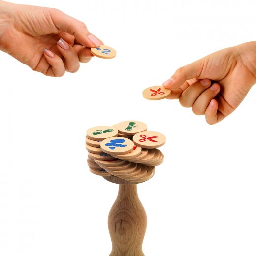 Игроки по очереди размещают фишки на крышке бутылки. Нужно первым избавиться от всех фишек на руках. Выкладывайте фишки в "высоту", в "ширину"... или ставьте их на ребро, озадачивая соперников. Используйте суперфишки, чтобы помешать соперникам закончить игру раньше вас. Им придется пропускать ход, брать штрафные фишки, обмениваться фишками с другими игроками и т.д.