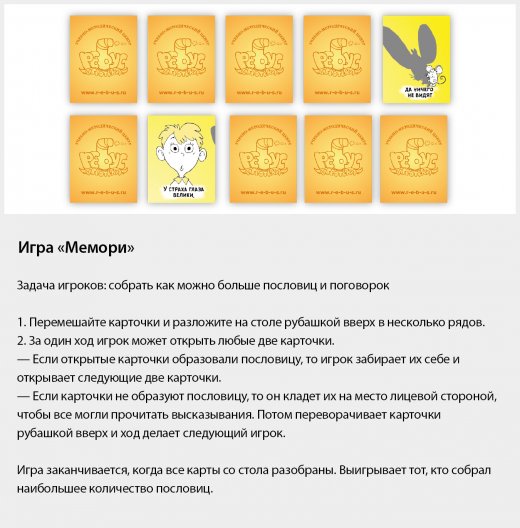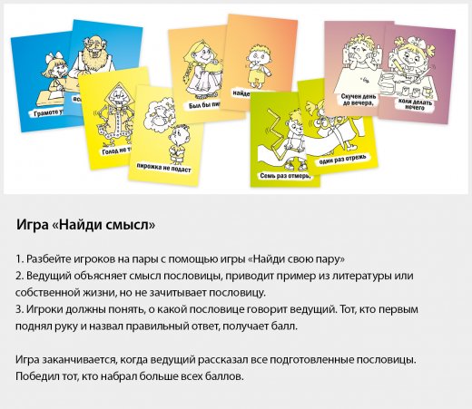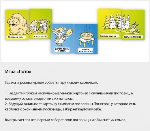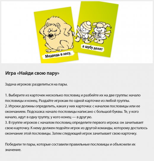 Выигрывает тот, кто больше всех наберет парных карточек, составляющих единую пословицу.