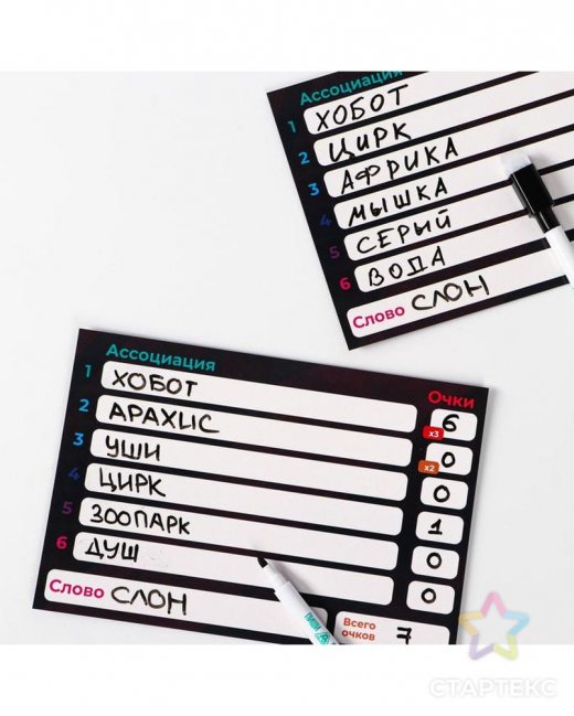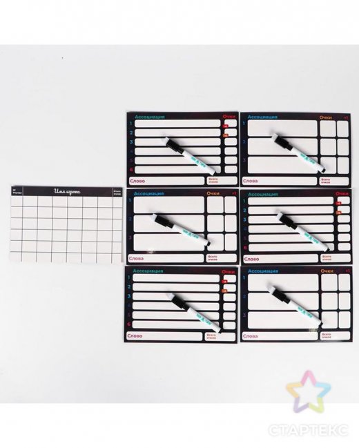 Для начала раздайте каждому участнику по одному планшету и маркеру. А турнирную таблицу поместите в центре стола. Осталось только определить очерёдность хода и начать игру! Задача участников — набрать как можно больше очков.