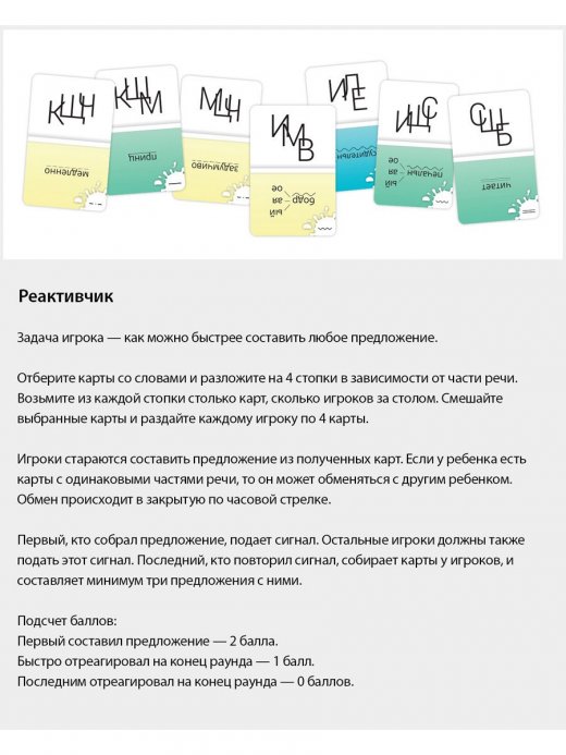 3. Реактивчик. Цель игры: как можно быстрее составить любое предложение. Время игры: 10-20 минут. Количество игроков: 3-10 человек. Количество карт: 80.