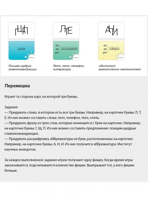 4. Перемешка. Цель игры: выложить ряд из 7 карт так, чтобы у каждой карты была как минимум одна общая буква с соседней картой. Время игры: 5-20 минут. Количество игроков: 2-7 человек. Количество карт: 80.