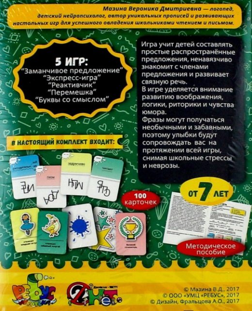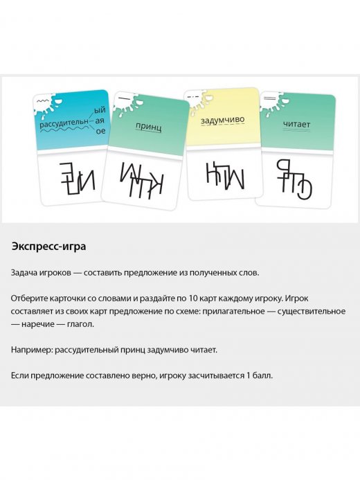 1. Экспресс-игра. Цель игры: составить предложение из полученных слов. Время игры: 10-20 минут. Количество игроков: 3-8 человек. Количество карт: 80.