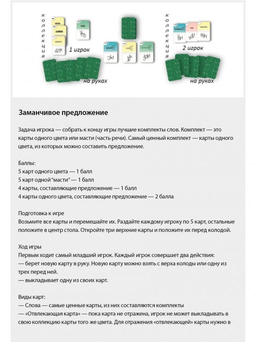 2. Заманчивое предложение. Цель игры: собрать к концу игры карты, объединенные общим цветом или частью речи, в идеале из которых можно составить предложение. Время игры: 30-50 минут. Количество игроков: 2-6 человек. Количество карт: 100.