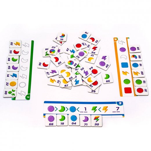 В игре 10 разных уровней и 180 заданий. Игроки должны подбирать тайлы к своему заданию на скорость. Кто справился первым - берет задание сложнее. Остальные остаются на том же уровне, а значит в следующем раунде им будет проще!
