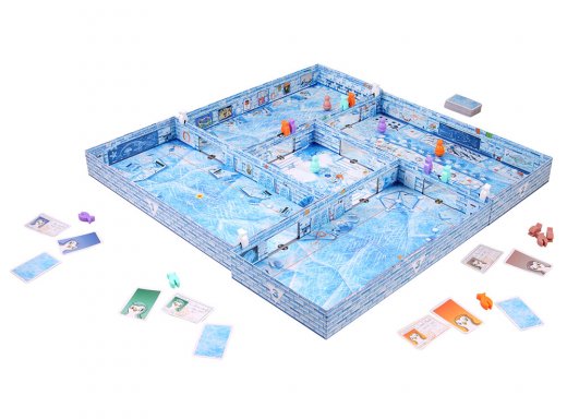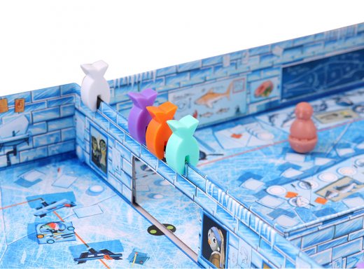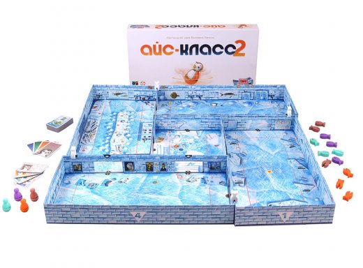 В состав настольной игры «Айс-класс 2» входит: 4 пластмассовых пингвина, 5 картонных коробок-комнат, 16 пластмассовых фишек рыбы; 54 рыбные карты; 4 карты-памятки; 4 пропуска для пингвинов, правила игры.