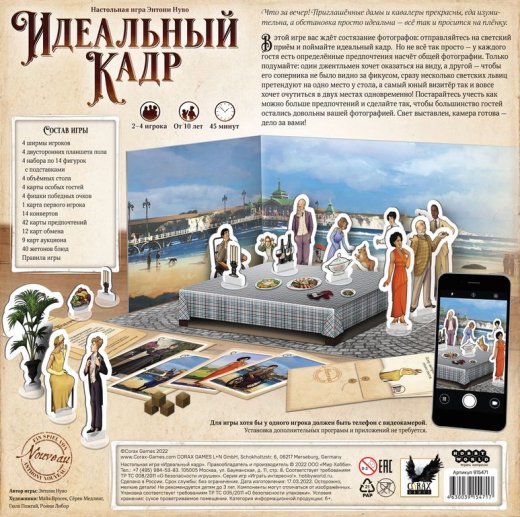 "Идеальный кадр" – это семейная настольная игра про соревнование фотографов на роскошной вечеринке. Им предстоит учесть пожелания четырнадцати гостей, при этом не имея полной информации об этих желаниях и узнавая её от других игроков (но они могут и скрывать то, что знают)! Чем больше гостей останутся довольны фотографией, тем больше победных очков вы получите.