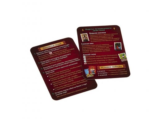 Там на неведомых дорожках следы невиданных зверей. В королевских лесах кроме помощников обитают еще и другие волшебные создания обладающие магической силой. Например, Дикие гномы могут одарить вас особыми способностями. Коварные Ведьмы-менялы поменяют любую карту в вашем королевстве. А еще сонные ивы растут по всему лесу и усыпляют ваших королев! Так что будьте бдительны, иначе вы не сможете спасти короля...