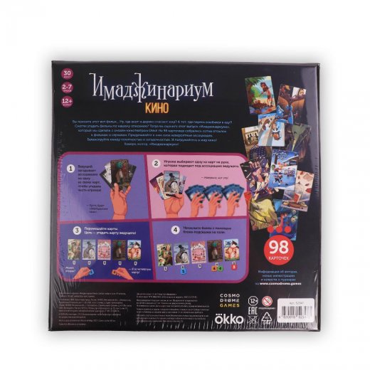 «Имаджинариум: Кино» — приключение, которое заслуживает Оскара или, что ещё важнее, вашего внимания. В этой версии культовой настольной игры на ассоциации мы оставили знакомых героев из ваших любимых фильмов и сериалов. Обещаем: никаких спойлеров!Если вы знакомы с любым другим «Имаджинариумом», то быстро вспомните, как играть, и сразу же погрузитесь в царство воображения и ностальгии. А если нет, то правила можно понять буквально за пару минут.Ведущий выбирает одну из своих иллюстраций и придумывает на неё остроумную ассоциацию. Остальные игроки подбирают из своих карт самую подходящую по смыслу и образам. Выкладывают эти карты в закрытую в центр стола, перемешивают и вскрывают. Цель каждого — найти то, что загадал ведущий.А у ведущего — сделать так, чтобы угадало как можно больше игроков, но не все. Иначе он не получит победные очки.Плюс этой версии в том, что вы увидите 98 уникальных иллюстраций, которых нет в других наборах. На каждой карточке будут известные образы, которые даже заставят вас пересмотреть любимые шедевры. Это вы сможете сделать на сервисе Okko, совместно с которым мы и сделали эту игру.Играйте в настольные игры, смотрите фильмы и получайте только позитивные эмоции.