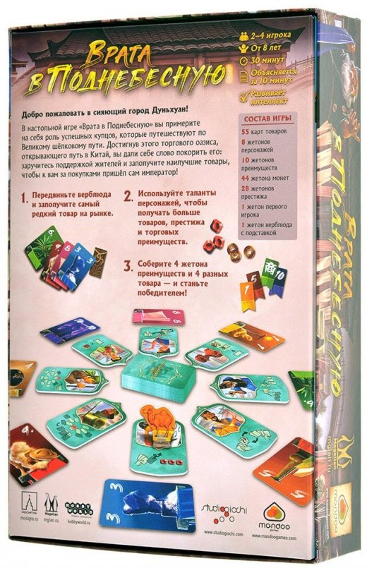 "Врата в Поднебесную" – карточная экономическая стратегия, в которой вы возьмёте роли предприимчивых торговцев. Пополняя прилавок экзотическими товарами, планируя действия и предугадывая шаги оппонентов вы будете приближаться к господству над Дуньхуаном!