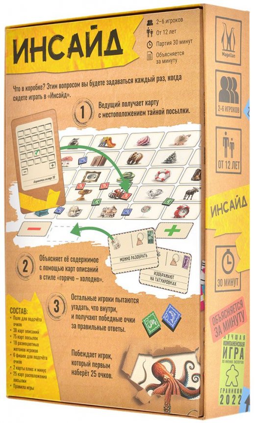 Что в коробке? Вот главный вопрос, над которым будут ломать головы участники настольной игры "Инсайд". Это простая, быстрая и весёлая игра, которую вполне уместно разложить в любой компании и в любое время, будь то вечеринка с друзьями или уютная посиделка в кругу семьи. Попробуйте угадать, что находится в посылке, будьте к ней ближе остальных и получите больше победных очков!