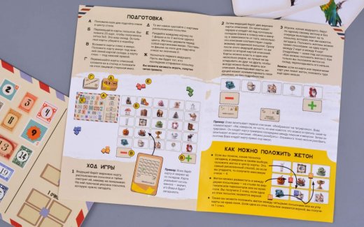 В игре есть несколько типов карт: посылки, описания и расположения. Выложите в центр стола 25 карт посылок сеткой 5 на 5 изображением вверх, а остальные уберите. Под нижней левой картой этой сетки положите карту со знаком минус, а под нижней правой со знаком плюс. Каждый участник получает фишку и 3 жетона своего цвета. Теперь всё готово к игре.