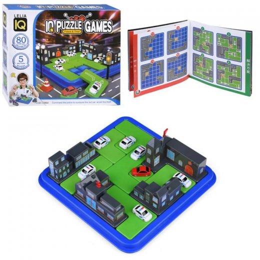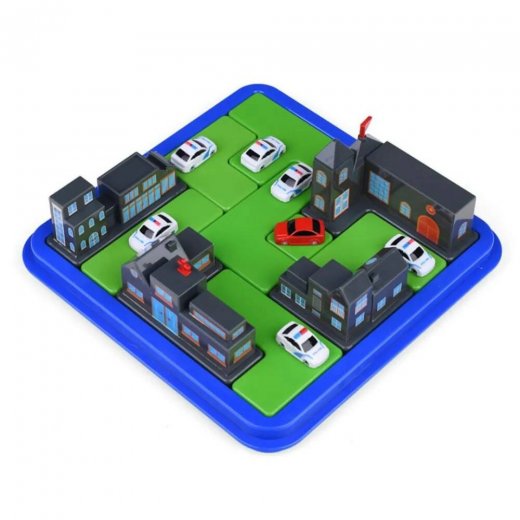 Выбери задание. Расположи пазл с красной машиной и пазлы с домами на игровой доске. Эти пазлы нельзя переставлять вовремя выполнения выбранного задания. Расставь 6 полицейских машин на игровой доске таким образом, чтобы заблокировать красную машину. Красная машина не может проехать через полицейские машины и здания. Красная машина не может проехать по диагонали. Как только ты расставишь все полицейские машины, заблокировав красную машину, ты справился с заданием! Существует только один вариант решения. Ответ находится в книгес заданиями.