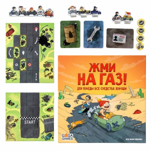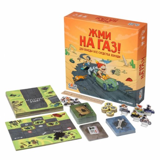 Врум-врум! Заскучали от однообразных способов испортить жизнь товарищу по игре и хотите пробовать новое? Скорее заводите моторы и устраивайте безбашенный настольный заезд! Жми на Газ — динамичная, азартная и непредсказуемая гонка, в которой игроки будут мчаться по трассе, заправлять и прокачивать свою тачку прямо на ходу, подкидывая подлянки соперникам. Ради победы каждый гонщик готов на самые грязные уловки, но кто же первым достигнет финишной черты и станет обладателем главного приза — Золотого Колеса?
