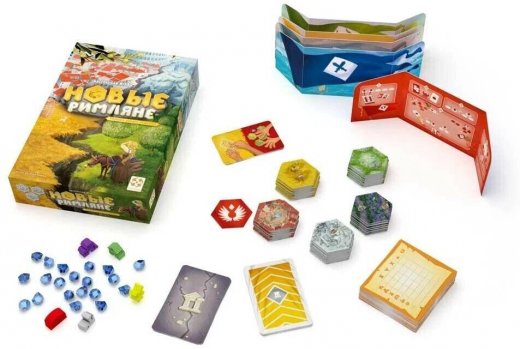 В состав игры Новые римляне входит: 100 участков земель ; 40 фишек построек ; 20 кристаллов; 10 карт выбора ; 5 карт построек; 5 двусторонних карт-памяток; 5 ширм; 1 блокнот для подсчёта победных очков, правила игры.