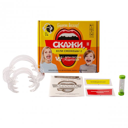 «Скажи, если сможешь»  - это  веселая игра для компании из детей и взрослых. Попробуй правильно и внятно прочитать текст с карточки, используя  пластиковый загубник. При этом твои друзья должны понять, что же ты сказал?!