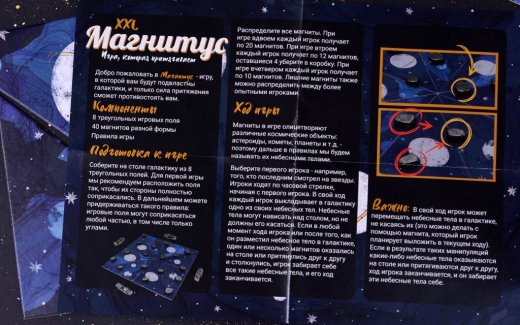 Сотворить собственную галактику – возможно! Окунитесь в мир звёздной пыли вместе с настольной игрой "Магнитус". Перед началом игры необходимо собрать поле, на котором будут размещаться магниты – своеобразные космические тела (планеты, астероиды и т. д.). Задача игроков – распределить их так, чтобы они не притянулись друг к другу и не произвели коллапс. Участники могут перемещать объекты без использования рук, а с помощью других магнитов. Победителем окажется тот, кто выложит все магниты на космическое поле, при условии, что они не притянутся друг к другу и не окажутся на столе. В этом случае другие игроки получают штрафные баллы, равные количеству оставшихся у их небесных тел. Также можно играть в одиночном режиме. Игра можно усложнить, добавив в ней правило чёрных дыр. Всё в ваших руках!