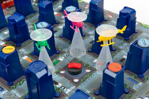 На игровом поле расставляются 25 трехмерных зданий, которые можно поднять, чтобы спрятать внутри угнанный автомобиль. В свой ход угонщик перегоняет машину из текущего укрытия в соседнее здание, оставляя следы. Игроки-полицейские в это момент сидят с закрытыми глазами и не подглядывают. Затем наступает ход полицейских. Они открывают глаза и могут выполнить одно из 2 возможных действий для каждого вертолёта: переместиться на соседний перекрёсток или обыскать одно из ближайших к вертолёту зданий.