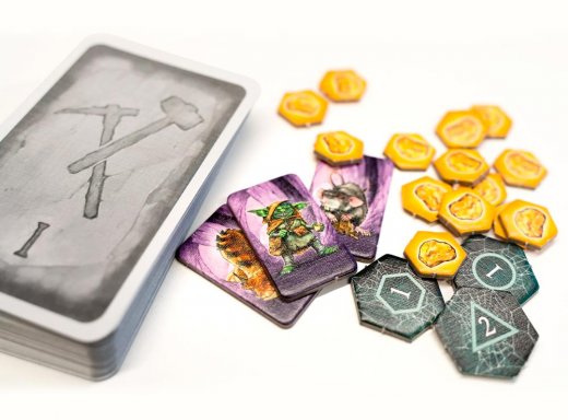 В состав настольной игры Гномы-вредители. Тёмная пещера входят: 110 карточек, 49 жетонов, 11 фишек с подставками, правила игры.