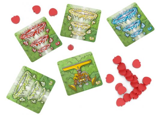 У каждого игрока есть секретная пара охотников за яблоками. Каждый ход игроки выкладывают карточки механизмов, чтобы направить падающие с ветки яблоки в свои корзины или играют карточки действий, с помощью которых можно повернуть или уничтожить механизмы конкурентов!
