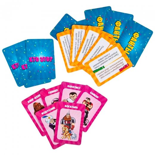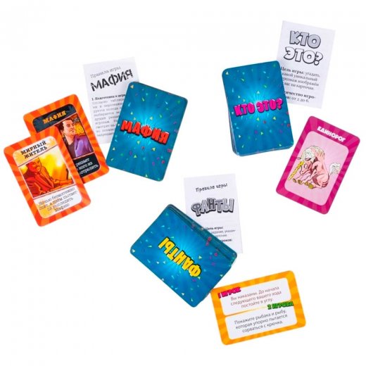 В комплект входят такие игры как «Мафия» – командная ролевая игра, повествующая о непримиримом противостоянии Мафии и Мирных жителей; «Фанты» – самые лучшие и интересные задания на смекалку, которые помогут проявить себя с новой стороны и провести время весело; «Кто это?» – увлекательная игра, в которой игроки, задавая вопросы, угадывают, кто или что изображено у них на карточках.