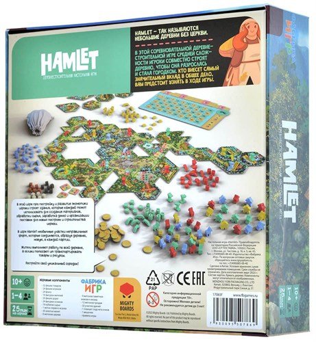 Интересный факт: словом Hamlet в британском английском языке называют небольшую деревушку без церкви. Отсюда и пошло название этой соревновательной настольной игры, в которой вам вместе с остальными игроками предстоит развивать деревню, присоединяя к ней новый участки земли и строя на них различные производственные здания.