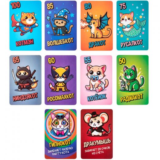 Цель игры: собрать 9 одинаковых карточек с котами путём обмена с другими игроками.
