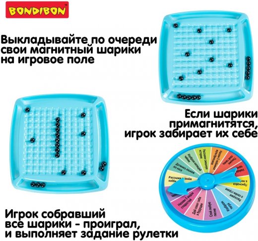 Внаборе: 20 магнитных шариков, игровое поле, рулетка с заданиями, мешочек.