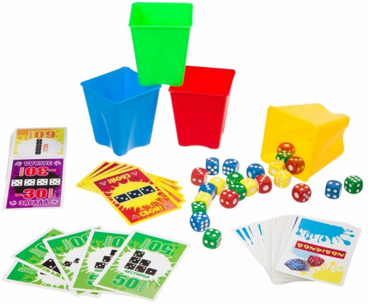 Количество игроков 2-4. В комплект входят карточки с заданием - 50 шт., игральные кости - 24 шт., чаша - 4 шт.