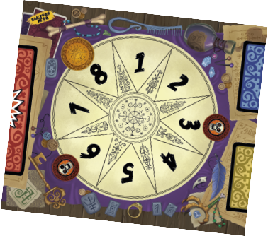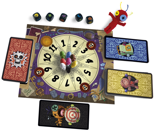 Бросайте кубики и получайте ингредиенты, разыгрывайте карточки с руки, чтобы накладывать проклятия, зарабатывайте победные очки и не забывайте выполнять условия проклятий, наложенных на вас!