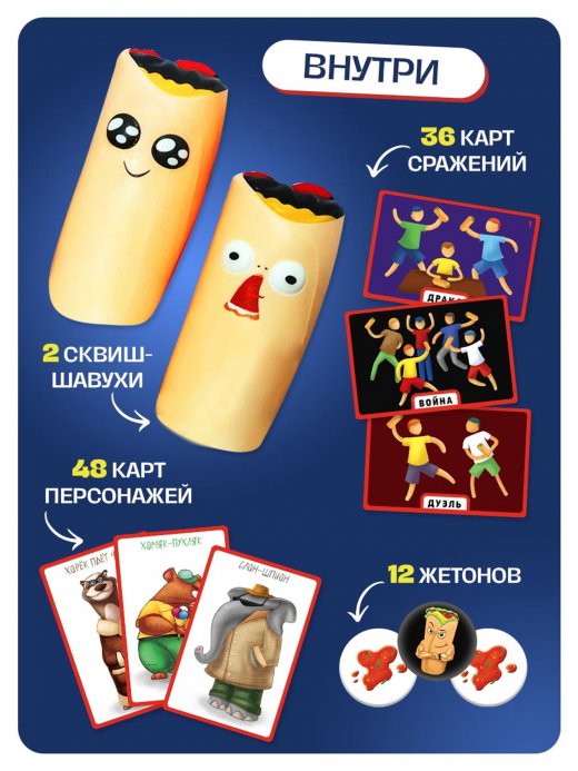 «Бешеная шавуха» — настольная игра для детей от 7 лет. Увлекательная настолка подготовила весёлый и развлекательный сюжет для озорных деток, где они могут побаловаться и интересно провести время. Ребёнку предстоит собирать карточки и зарабатывать очки, бросаясь игрушечной шаурмой.