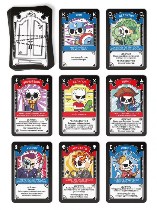 - 24 карты (15 карт основных персонажей - 3 «Детектив», 3 «Кощей», 3 «Киборг», 3 «Ворохоббит», 3 «Кэп»; 6 карт дополнительных персонажей - «Пират», «Наследник», «Мститель», «Огр», «Хулиган», «Волшебник»; 3 карты-памятки)