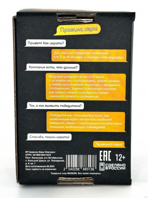 Ведущий зачитывает карточку с входящим сообщением. Задача игроков — выбрать самые смешные ответы из карточек на руках. Эта игра заставит вас по-новому взглянуть на привычные переписки и непринужденные разговоры, превращая каждое сообщение в повод для юмористической дуэли.