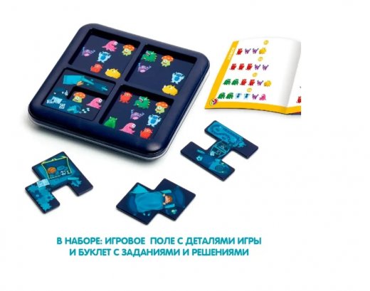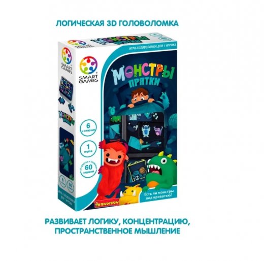 Логическая игра Монстры прятки серии SmartGames от Bondibon — это интересная головоломка для детей, которая сочетает в себе развлечение и развитие. Настольная игра подходит мальчику и девочке. Она станет отличным нейротренажером, помогающим развивать логику, внимание и пространственное мышление. Эта умная развивашка, которая поможет вашему сыну или дочке справиться со страхом темноты в игровой форме. Она точно понравится первокласснику и школьнику постарше, превращая свободное время в веселое обучение. Логические настолки - это отличный подарок на день рождения, новый год, выпускной или любой другой праздник. Поместите 4 детали головоломки на игровое поле таким образом, чтобы скрыть всех монстров, кроме тех, которые изображены в задании. 60 заданий разной сложности, которые делают игру интересной для детей и взрослых. Настолка помогает детям ""прятать"" монстров на игровом поле, что способствует отработке страха темноты в легкой оригинальной форме. В комплекте: буклет с заданиями, игровое поле и детали головоломки. Предназначена детям от 6 лет. Пластиковые 3д детали, которые легко собирать и разбирать, делают набор удобным для использования дома, в детском садике или школе. Игру удобно брать в дорогу, так как все детали находятся на компактном игровом поле с крышкой. Яркий дизайн и увлекательные задания, превращают игру в настоящий квест и взрыв мозга. Нейроигры - это умный выбор для родителей, которые хотят подарить своему ребенку не только интересные, но и полезные товары. Обучающие и дидактические элементы способствуют развитию iq и логических навыков. Соберите коллекцию развивающих игр для малышей серии Smart games и Бондилогика! В коллекции товаров от Бондибон представлены детские развивающие игрушки для девочек и мальчиков, крутые необычные развивашки для подростков, популярные игры для всей семьи!