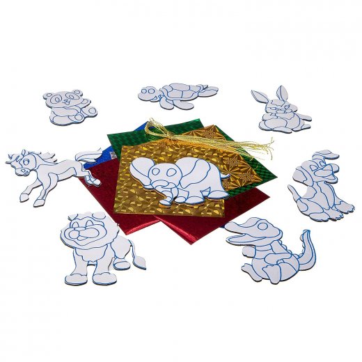 Ребёнок сможет сделать красивые и оригинальные наклейки, декорируя фигурку фольгой из набора. Для этого берём лист, выбираем понравившееся изображение. По контурам выбранной фигурки содержатся несколько наклеек. Аккуратно снимаем одну из них. Выбираем металлизированную плёнку по цвету, которой Вы хотите окрасить данный участок фигурки. Кладём плёнку на фигурку, таким образом, чтобы сторона с цветом, в который Вы хотите окрасить, была обращена лицом к Вам. Потрите поверхность плёнки пальцем. Теперь самое интересное. Снимаем плёнку - часть фигурки окрасилась. Аналогичным образом декорируем всю фигурку. Фигурку можно использовать как наклейку и как украшение-подвеску. Чтобы сделать подвеску, нужно снять бумажный слой с оборотной стороны, прикрепить верёвочку и задекорировать фольгой.