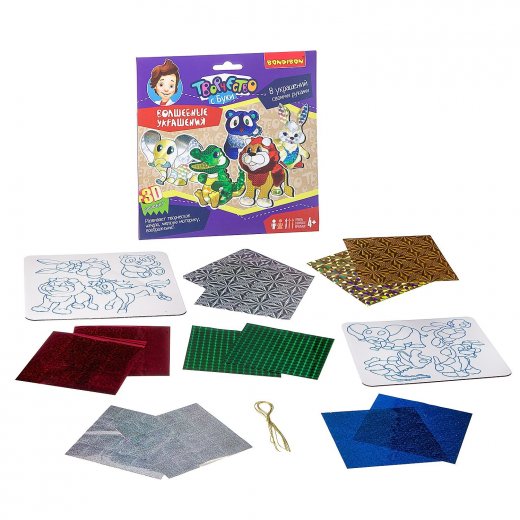 Состав набора: 2 листа с наклейками, 12 листов цветной, металлизированной пленки с голографическим эффектом, верёвочки, инструкция.
