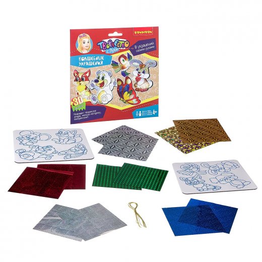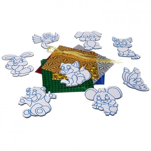 Состав набора: 2 листа с наклейками, 12 листов цветной, металлизированной пленки с голографическим эффектом, верёвочки, инструкция.