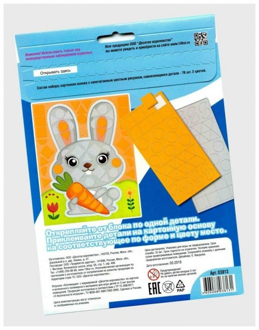 Комплектация: картонная основа с напечатанным цветным рисунком, самоклеящиеся детали 2 цветов – 76 шт.