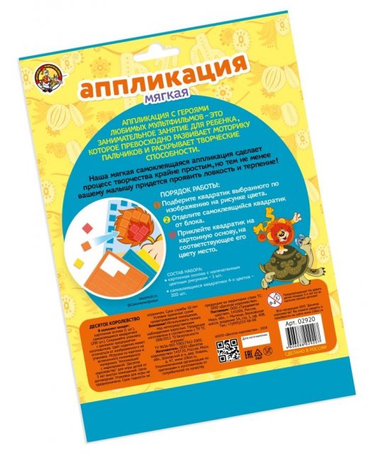 Мягкая самоклеящаяся аппликация «Львёнок и Черепаха» — набор для творчества для детей с героями одноименного мультфильма студии «Союзмультфильм». Аппликация развивает творческие способности малыша, тренирует логику, щипковый захват и точные движения кисти руки. Набор изготовлен из картона и вспененного полимерного материала. Украшайте картинку самоклеящимися квадратиками, подбирая нужный цвет и место. Набор содержит мелкие детали, поэтому контроль взрослого во время работы с аппликацией обязателен.