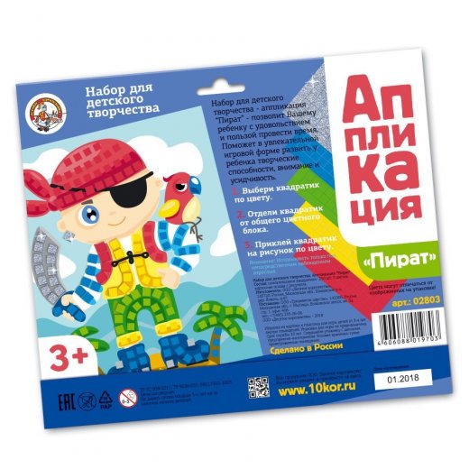 Детская аппликация «Пират» однозначно привлечет внимание малыша, а чтобы она стала еще привлекательней, придется приложить старание и усидчивость при наклейке квадратиков. Этот процесс превосходно разовьет моторику непослушных пальчиков и стимулирует творческие наклонности. Украшайте картинку самоклеящимися квадратиками, подбирая нужный цвет и место. Набор содержит мелкие детали, поэтому контроль взрослого во время работы с аппликацией обязателен.