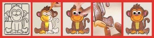 Изучите инструкцию на обороте комплекта и приступайте к изготовлению очаровательной витражной обезьянки. Разместите трафарет на гладкой поверхности и начинайте раскрашивать персонажа так, как это показано в руководстве. Все необходимые цвета есть в наборе. Закончите образ пластмассовыми подвижными глазками. Приклеить их можно при помощи все той же краски из комплекта. Когда обезьянка высохнет, отделите ее от рамки. Ваша витражная игрушка почти готова – осталось только вставить подставки в пазы трафарета!