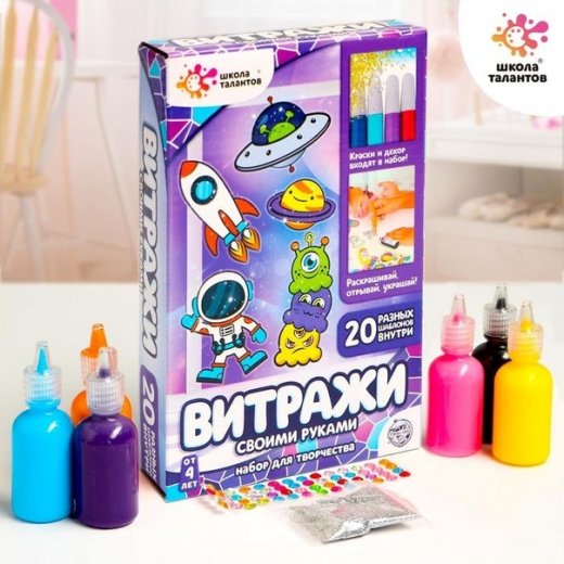 Набор Раскрась витражики Космос – это замечательный подарок для любителя творчества. С этим набором для творчества у ребёнка получится много разных изображений, ведь внутри 20 трафаретов для создания витражей. Просто залейте красками трафарет по инструкции и подождите, пока краска высохнет. Витражик готов. Его можно использовать в оформлении интерьера (приклеивать на стекла, зеркала, керамическую плитку и другие гладкие поверхности).