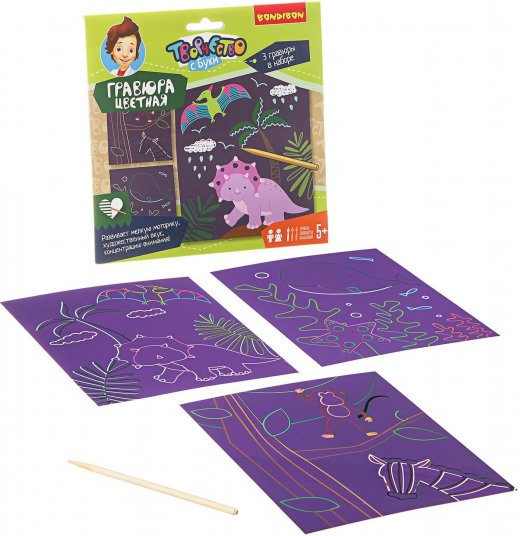 Цветная гравюра динозавры, животные, морские обитатели – послужит замечательным подарком для ребенка. Набор для творчества "Цветная гравюра" от компании Bondibon включает в себя 3 картинки. Этот тип гравюры разработан специально для самых маленьких: крупные детали, четкие линии, интересные сюжеты.