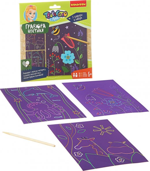 Цветная гравюра цветочная поляна, животные, морские обитатели – это весьма интересный и занимательный подарок для творческого ребенка. Набор для творчества "Цветная гравюра" от компании Bondibon включает в себя 3 картинки. Этот тип гравюры разработан специально для самых маленьких: крупные детали, четкие линии, интересные сюжеты.