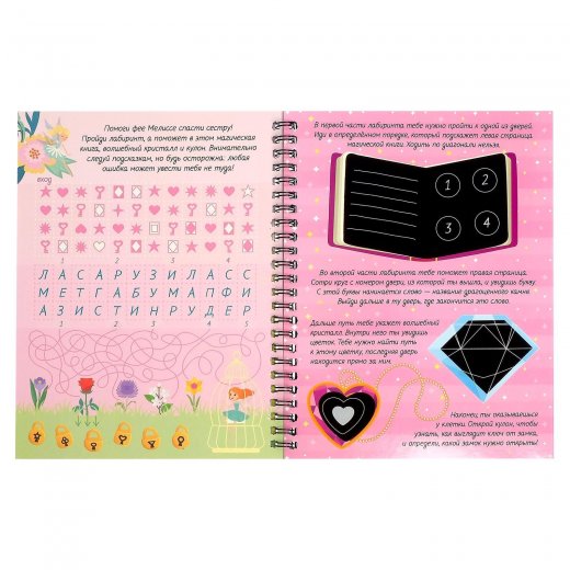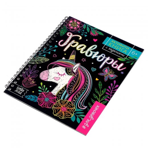 Активити-книга для девочек содержит увлекательные задания и волшебные картинки. Чтобы сделать гравюру, нужно просто стирать верхний слой с помощью деревянного штихеля. В книге 5 гравюр. У гравюр пёстрое основание, которое переливается всеми цветами радуги. В книге есть много интересных заданий: лабиринты, арифметические примеры, загадки.